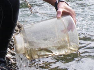 魚類にはさまざまな調査方法があります。実際の調査においては、以下にあげた方法の中から調査地点の環境に応じた効果的な手法を選択します。確認された種は個体数の記録や体長の計測、写真撮影等を行い、必要に応じてホルマリンを用いた液浸標本を作製します。(※調査は各都道府県の特別採捕許可を得てから実施します)