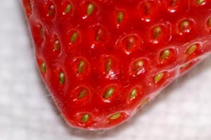 写真はイチゴです(見ればわかります!と言われそうですが…)。真冬ですのでネタに困っていました。目の前のテーブルに現れたのがイチゴでした。野生のものではありませんが植物です。イチゴの表面のツブツブは何でしょうか。正解は種ではなく果実です(下の写真)。果実ですのでツブツブひとつひとつの中に種が入っています。私達が食べている部分は、茎の変化したもので花托(かたく)と呼ばれ、茎の先が大きく膨らんだものです。