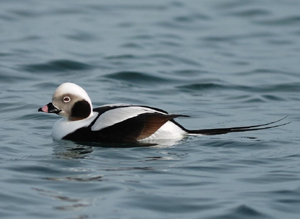 北の大地、最北のまち「稚内」。真冬に好んで訪れる人などいない場所。そこに我がNPO(e-tec)は行ったのでした。北海道の北端部、稚内の南50㎞ほどのところにある幌延深地層研究センターの視察が目的の旅でした。視察については誰かが紹介してくれると思うので、私の担当、生き物の話をします。写真はカモの仲間、コオリガモの雄です。冬鳥として北日本の海上に渡来する鳥です。北海道には比較的多く渡来し、湾内にいることもあり、今回のお目当ての一つです。頭、首回り、羽のなどの白色と、中央尾羽が長いのが特徴です。この写真のように見ることができれば、よかったのですが…。